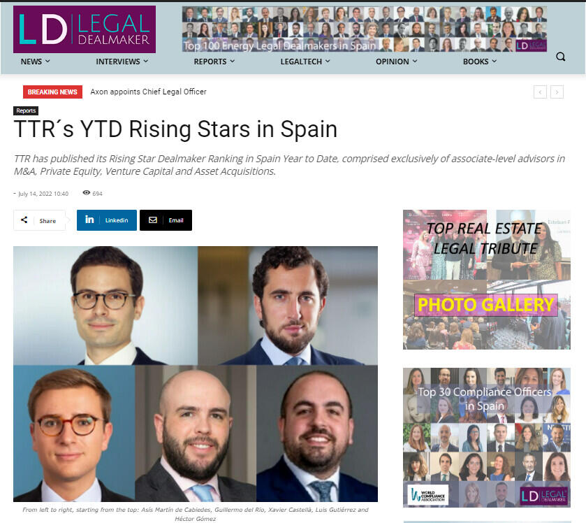 TTR has published its Rising Star Dealmaker Ranking in Spain Year to Date, comprised exclusively of associate-level advisors in M&A, Private Equity, Venture Capital and Asset Acquisitions.