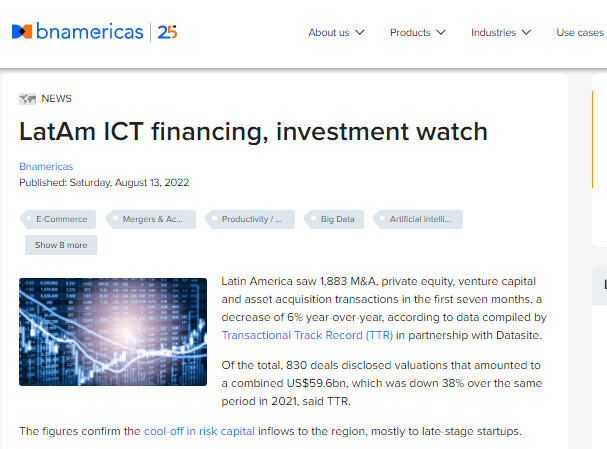 Latin America saw 1,883 M&A, private equity, venture capital and asset acquisition transactions in the first seven months, a decrease of 6% year-over-year, according to data compiled by Transactional Track Record (TTR) in partnership with Datasite.